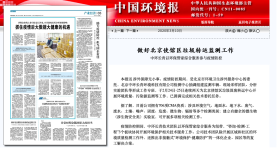 2020年3月10日,《中國環(huán)境報》報道我司以環(huán)保管家綜合服務(wù)參與疫情防控,在疫情防控期間承擔涉外環(huán)境監測,為北京使館區垃圾轉運提供環(huán)境保護技術(shù)服務(wù)工作。