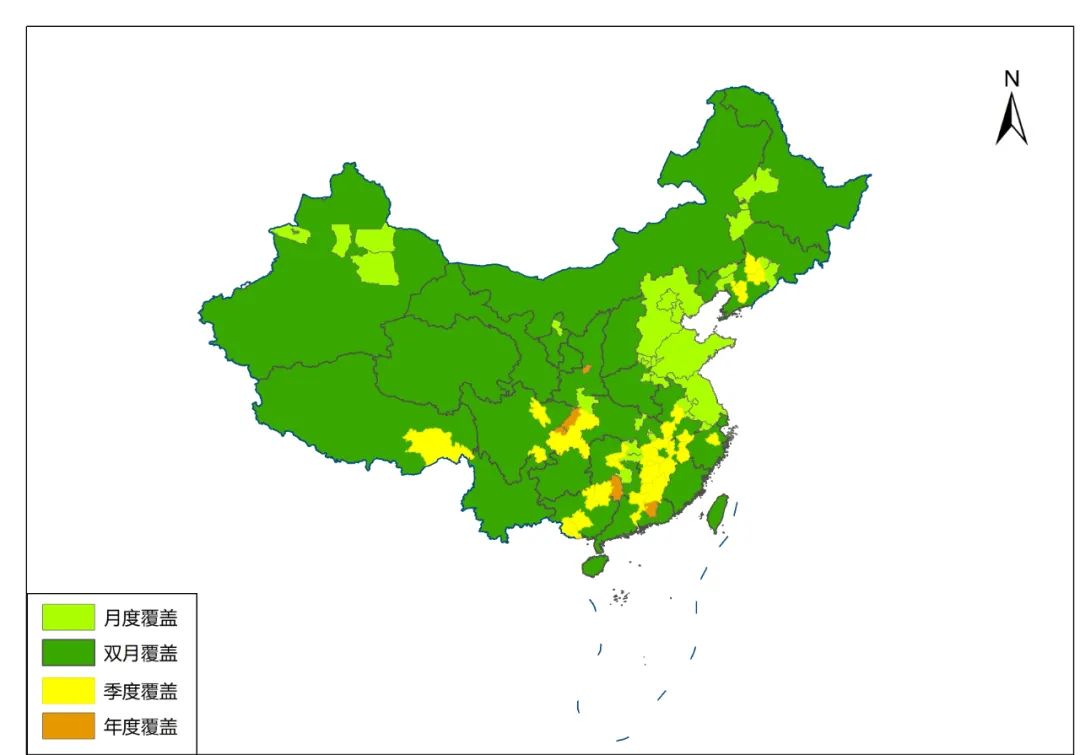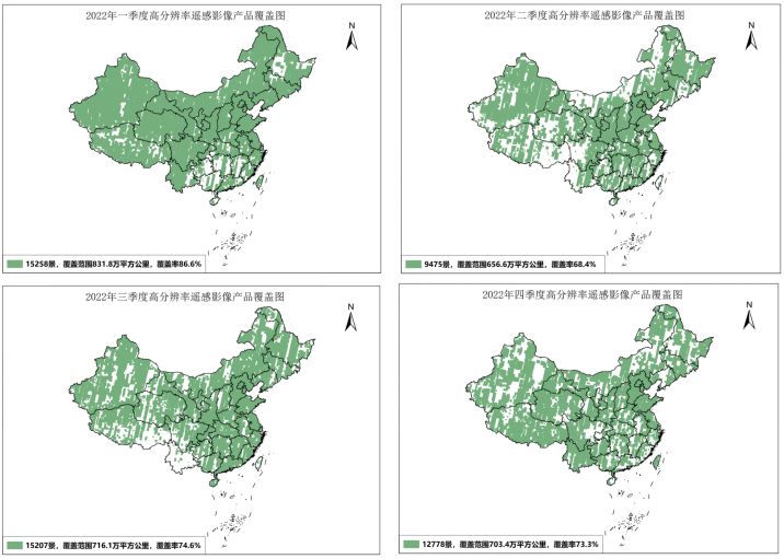 年度生產(chǎn)遙感影像產(chǎn)品76,223景,數據量約573TB,同比增長(cháng)4.3%。其中,時(shí)相為2022年的高分辨率融合影像產(chǎn)品共52,718景,數據量約為131.5TB,全國季度覆蓋率在68.4%-86.6%,年度覆蓋率為98.9%,30個(gè)省份實(shí)現了年度全覆蓋。