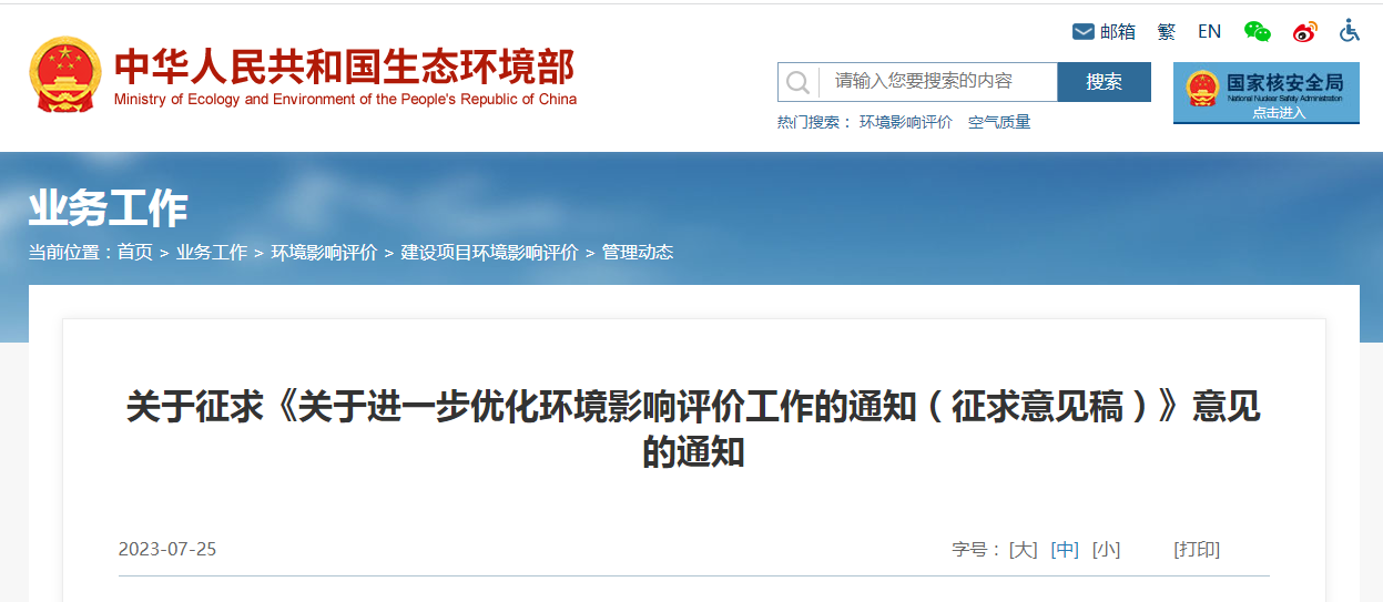 為進(jìn)一步加強環(huán)評與生態(tài)環(huán)境分區管控、排污許可、執法監管 等制度銜接聯(lián)動(dòng),進(jìn)一步發(fā)揮制度合力、提升源頭預防效能,守好綠水青山的第一道防線(xiàn),強化經(jīng)濟發(fā)展過(guò)程中的環(huán)評要素保障,近日生態(tài)環(huán)境部發(fā)布《關(guān)于進(jìn)一步優(yōu)化環(huán)境影響評價(jià)工作的通知》(征求意見(jiàn)稿)》,對進(jìn)一步優(yōu)化環(huán)境影響評價(jià)工作廣泛征求意見(jiàn)。