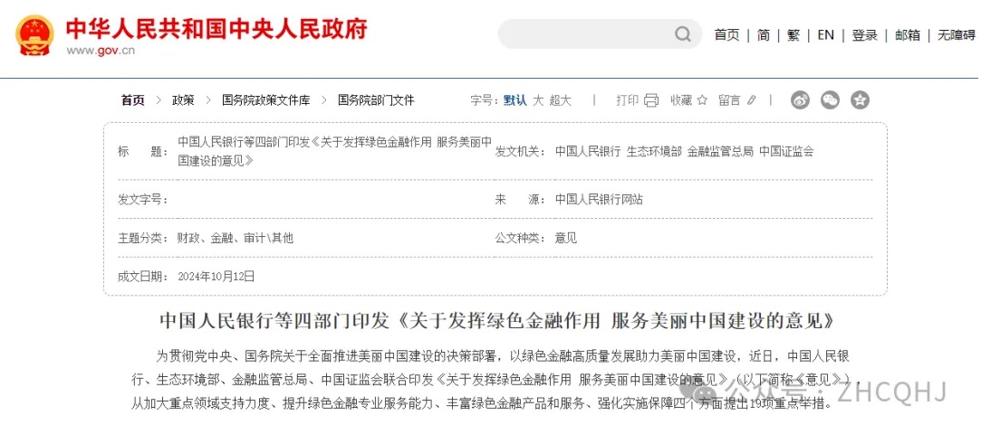 中國人民銀行、生態(tài)環(huán)境部、金融監管總局、中國證監會(huì )聯(lián)合印發(fā)《關(guān)于發(fā)揮綠色金融作用 服務(wù)美麗中國建設的意見(jiàn)》