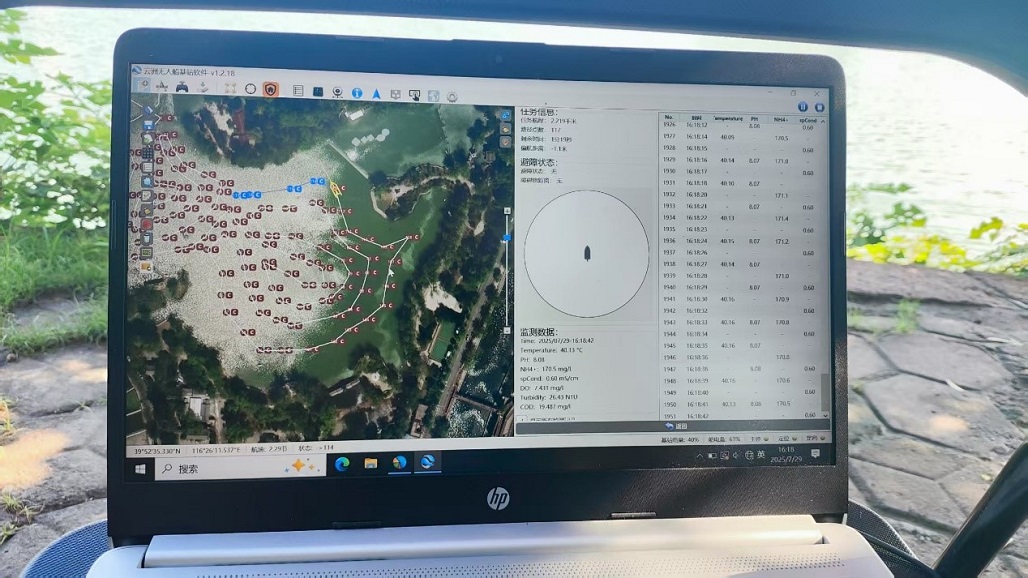 面對嚴峻形勢,中環(huán)長(cháng)青團隊立即啟動(dòng)應急預案,以確保能夠及時(shí)、準確地掌握水質(zhì)變化情況。在此次行動(dòng)中,無(wú)人船發(fā)揮了關(guān)鍵作用。這是一艘長(cháng)約1米多、寬不到1米的智能監測設備,別看它個(gè)頭不大,卻具備強大的功能。它可以按照預設的路線(xiàn),自動(dòng)在龍潭東湖中巡航,實(shí)時(shí)檢測包括pH值、溶解氧等7個(gè)參數的信息,并將數據迅速上傳至控制中心,操作人員在控制中心的電腦上即可實(shí)時(shí)觀(guān)察到各個(gè)參數的實(shí)時(shí)檢測數據。與傳統的人工監測方式相比,能夠快速、全面地覆蓋檢測區域,大大提高了檢測效率;并且能夠深入一些人工難以到達的復雜水域,獲取更全面、準確的數據,避免了人工檢測可能存在的盲區。在本次雨后水質(zhì)檢測工作中,無(wú)人船在龍潭東湖中穿梭,如同一位不知疲倦的衛士,細致地對湖水進(jìn)行全方位檢測,為后續的水質(zhì)評估提供了大量的基礎數據。