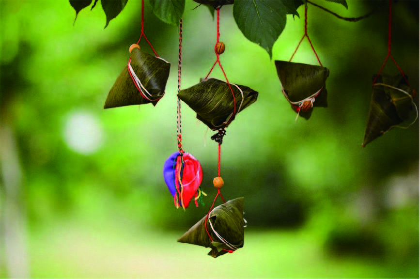 端午節小孩佩香囊,傳說(shuō)有避邪驅瘟之意。香囊內有朱砂、雄黃、香藥,外包以絲布,清香四溢,再以五色絲線(xiàn)弦扣成索,結成一串,形形色色,玲瓏可愛(ài)。