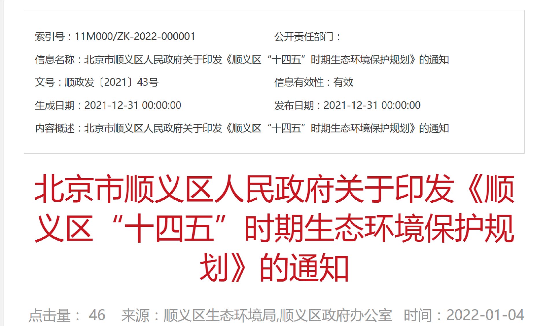 2021年12月31日,由中環(huán)長(cháng)青與中國環(huán)境科學(xué)研究院組成的技術(shù)團隊共同編制的《順義區“十四五”時(shí)期生態(tài)環(huán)境保護規劃》正式印發(fā)實(shí)施。