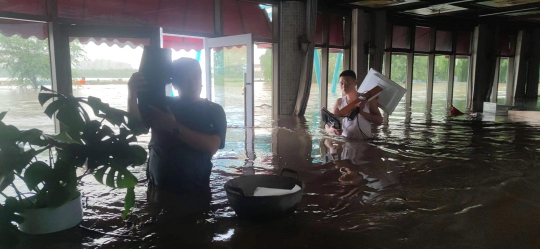 爭分奪秒180分鐘里;在齊腰深的洪水中,保障團隊將地下水研究中心一層的電腦、電視、衛星模型、無(wú)人機、中控設備等重要物資緊急轉移至二層暫存,隨即全體人員安全撤離,最大限度的保護了研究中心的物資安全。